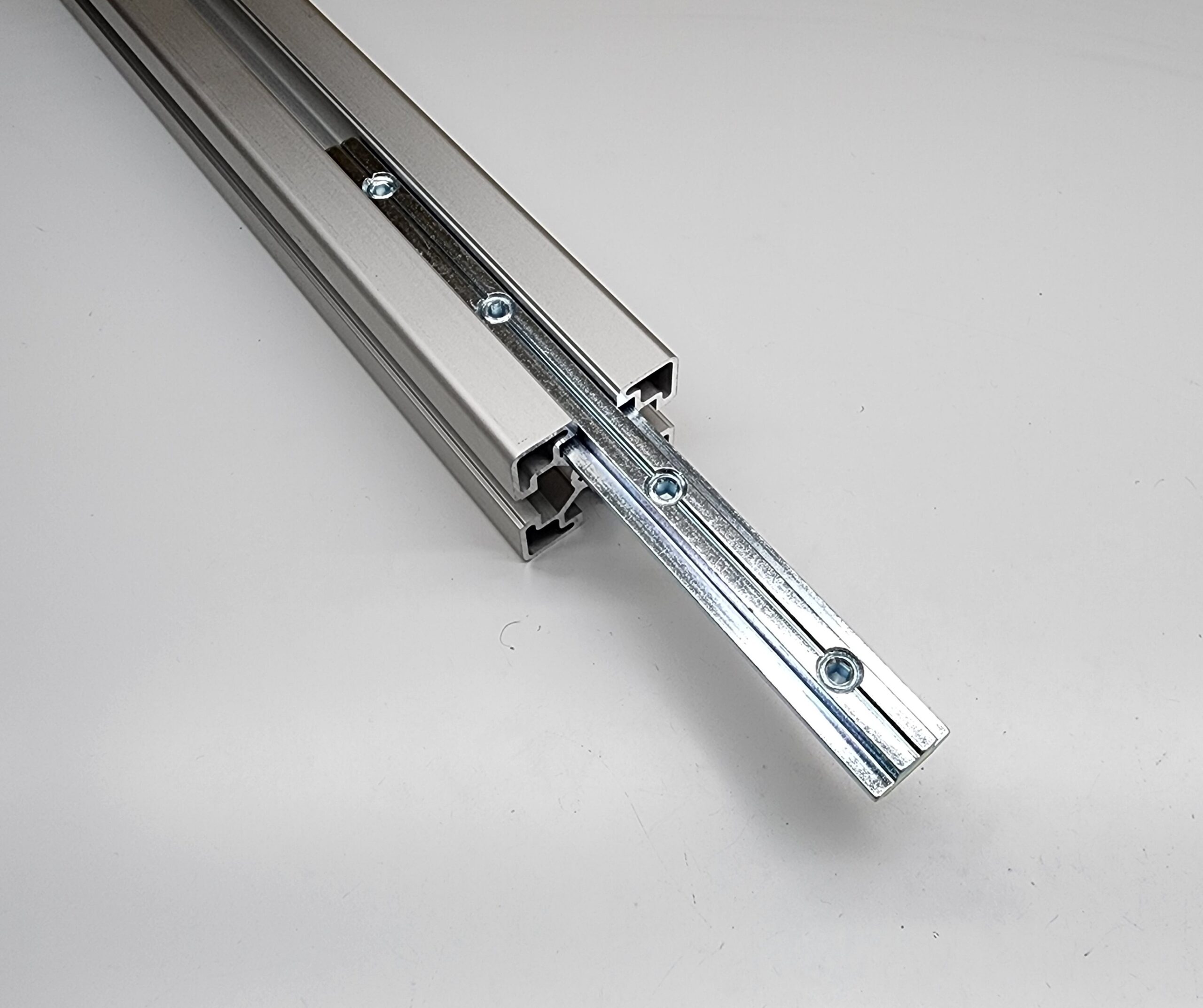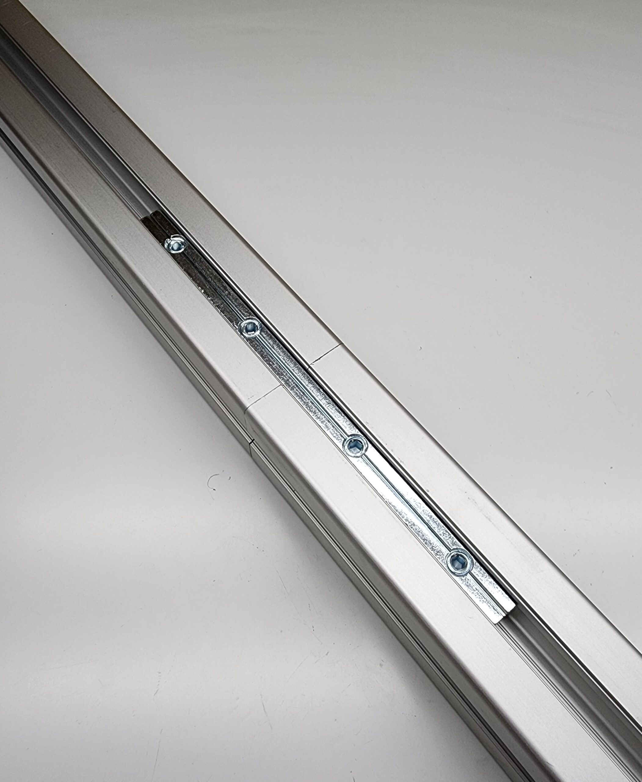 The connection strips slide inside the T-slots and secures with set-screws. Extrusions are cut square, and you will be able to connect two extrusions end to end. No additional machining is required.